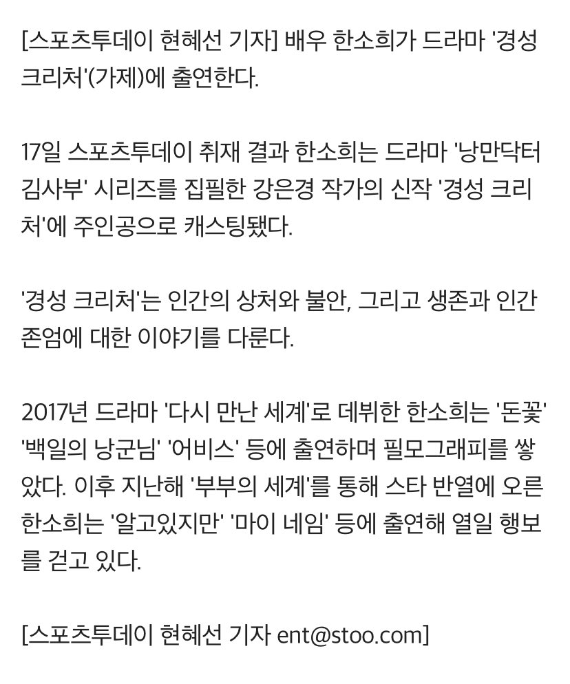 ์ค๋ ์๊ฐ๋๋ฆด ๋๋ผ๋ง๋ ์ต๊ทผ ํซํ ๋ฐฐ์ฐ์ธ ๋ฐ์์ค์จ๊ฐ ์ถ์ฐํ์ ๊ฒฝ์ฑ ํฌ๋ฆฌ์ฒ๋ผ๋ ๋๋ผ๋ง์