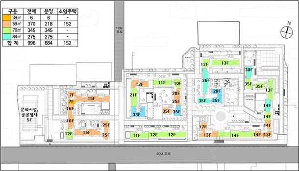 ์ค๊ณต๋์์ผ๋ฉฐ ์ง์5์ธต 840์ธ๋์ ์ ์ธต๋จ์ง๋ก ์ธ๋๋ณ ์ ์ฉ๋ฉด์ ์ 31ใก, ๋์ง๋ฉด์ ๋ฅ ์ 93%์ด๋ค. ๋ฆฌ๋ชจ๋ธ๋ง์ ํตํด ์ด 996๊ฐ๊ตฌ, ์ฉ์ ๋ฅ 299.73%, ์ต๋ 35์ธต ์ํํธ๋ก ๋ณ์ ํ๋ค. ๋