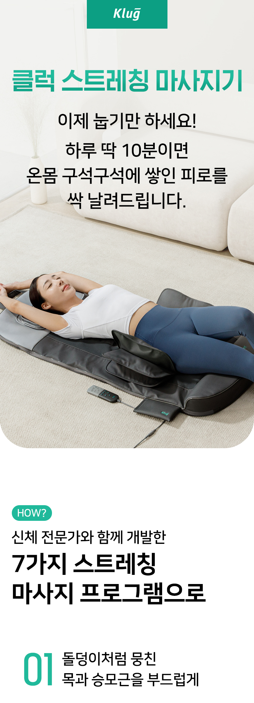 ๋ฑ์ผ๋ก ์ธํด ์ค๋ด์ํ์ด ๋์ด๋๋ฉด์ ์ด๋๋์ด ๋ถ์กฑํด์ง๊ณ  ์์ธ๊ฐ ํํธ๋ฌ์ง๋ฉด์ ๋ชฉํต์ฆ, ํ๋ฆฌํต์ฆ, ์ด๊นจ๊ฒฐ๋ฆผ ๋ฑ ๊ทผ๊ณจ๊ฒฉ๊ณ ์งํ ํ์๊ฐ ์ฆ๊ฐํ๊ณ  ์๋ค. ์ด๋ฌํ ์ํฉ์์์ ๊ฐํธํ๊ฒ ๊ทผ์ก์ ํ์ด์ค ์ ์๋ ์๋ง๊ธฐ์ธ ํด๋ญ(Klug)๋ง์ฌ์ง๊ธฐ๊ฐ ์ธ๊ธฐ๋ฅผ ๋๊ณ  ์๋ค.